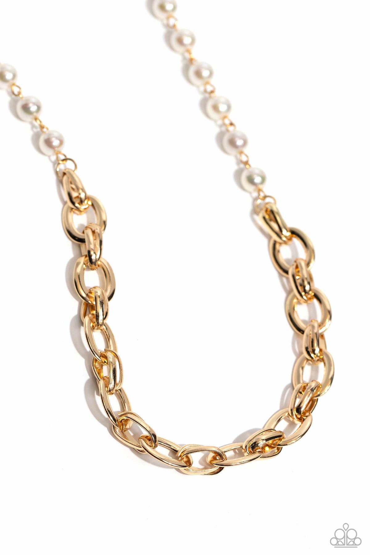 Gleaming white pearls combine with oversized silver links to create a half-and-half fashionable mashup down the neckline for a refined, carefree finish. Features an adjustable clasp closure.