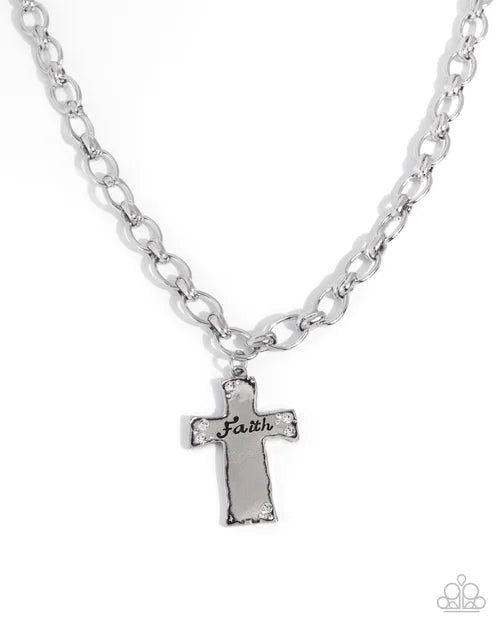 Dusted with dainty white rhinestone details, an abstract-cut silver cross pendant, with the word "faith" stamped across its center in a curly font, sways below the neckline from a glistening abstract silver chain for a radiantly reverent display. Features an adjustable clasp closure.