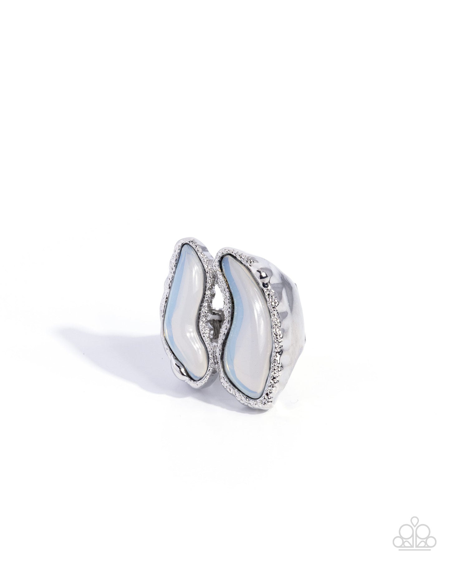 An asymmetrical transparent white acrylic is split in two and then pressed into a sleek silver-textured frame for an artisanal-inspired centerpiece. Features a stretchy band for a flexible fit.