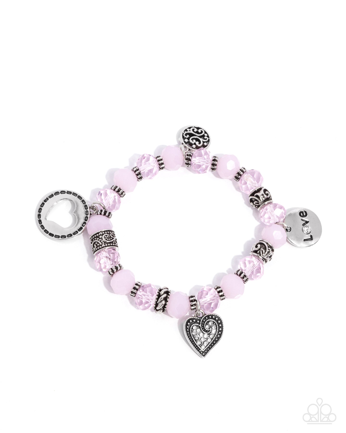 Faceted and crystal-like pink beads join shimmery filigree and twist-textured silver accents along a stretchy elastic band, creating a whimsical look around the wrist. A white rhinestone and silver-studded heart, a silver pendant with the stamped word "LOVE" with the "o" being a rhinestone, a filigree-textured disc, and an airy heart silhouette disc charismatically sway along the display for a romantically vintage finish.