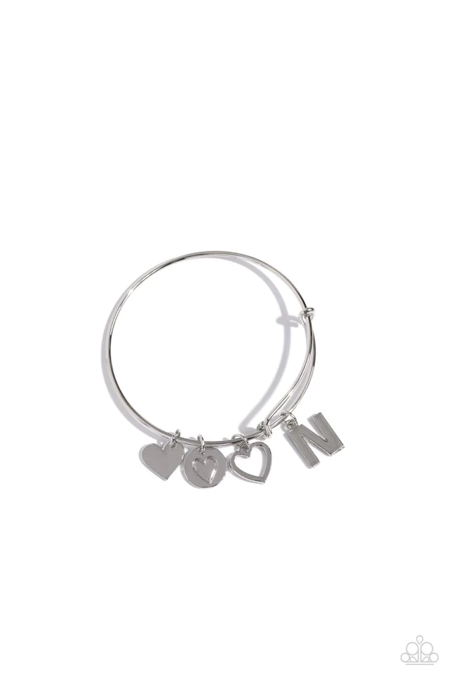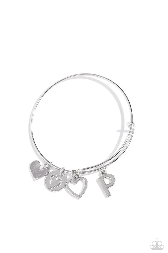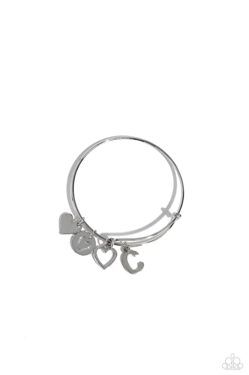Featuring shiny silver, airy, and stamped finishes, a mismatched collection of dainty heart charms, and the letter "A, B, C, L, M, N, or P" glides along a silver bar fitting at the center of the wrist for a romantic, sentimental flair.
