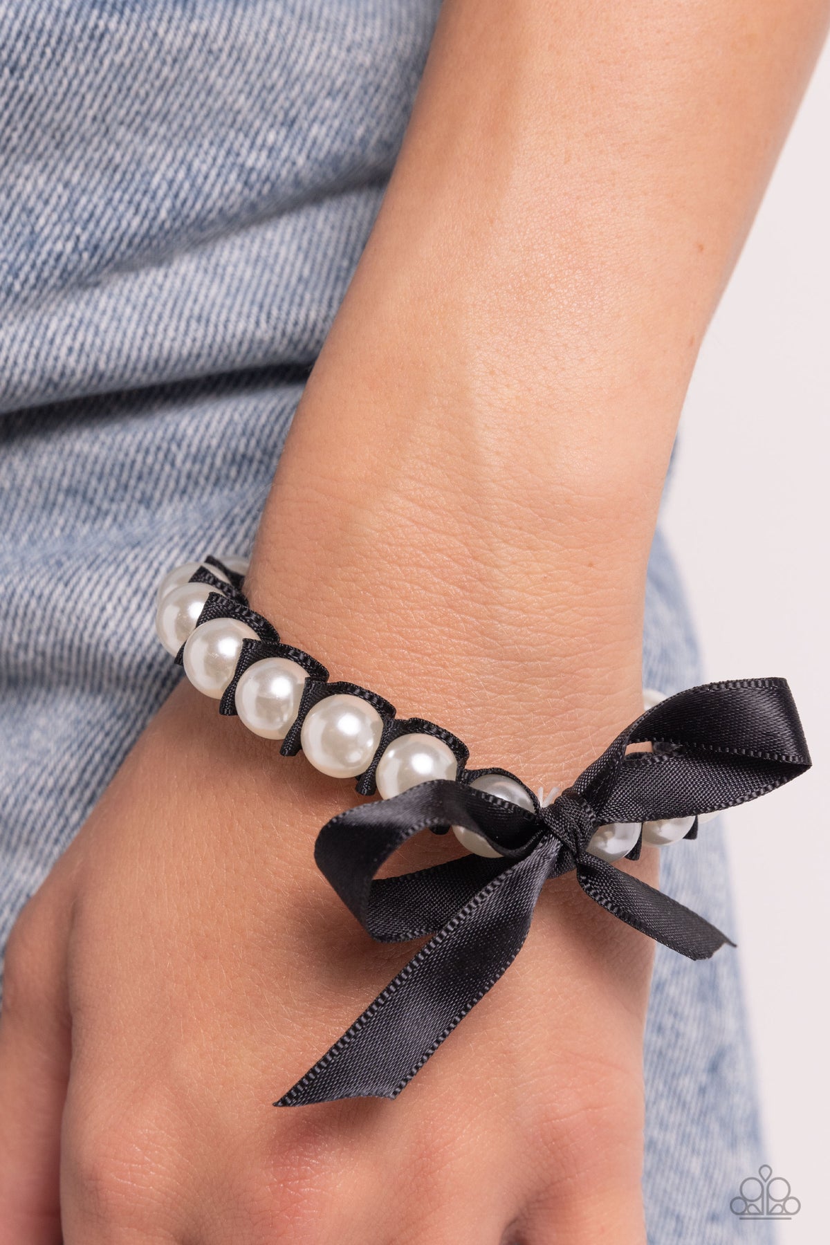 Delicately wrapped in the folds of a baby pink ribbon, gleaming white pearls are infused along an elastic stretchy band around the wrist for a feminine, girly statement.