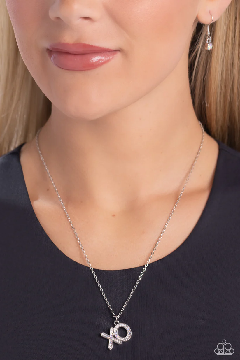 Cascading from a dainty silver chain, the silver letters "XO" are embossed in various glistening white rhinestones, creating a romantic ombré statement down the neckline. Features an adjustable clasp closure. Due to its prismatic palette, color may vary.