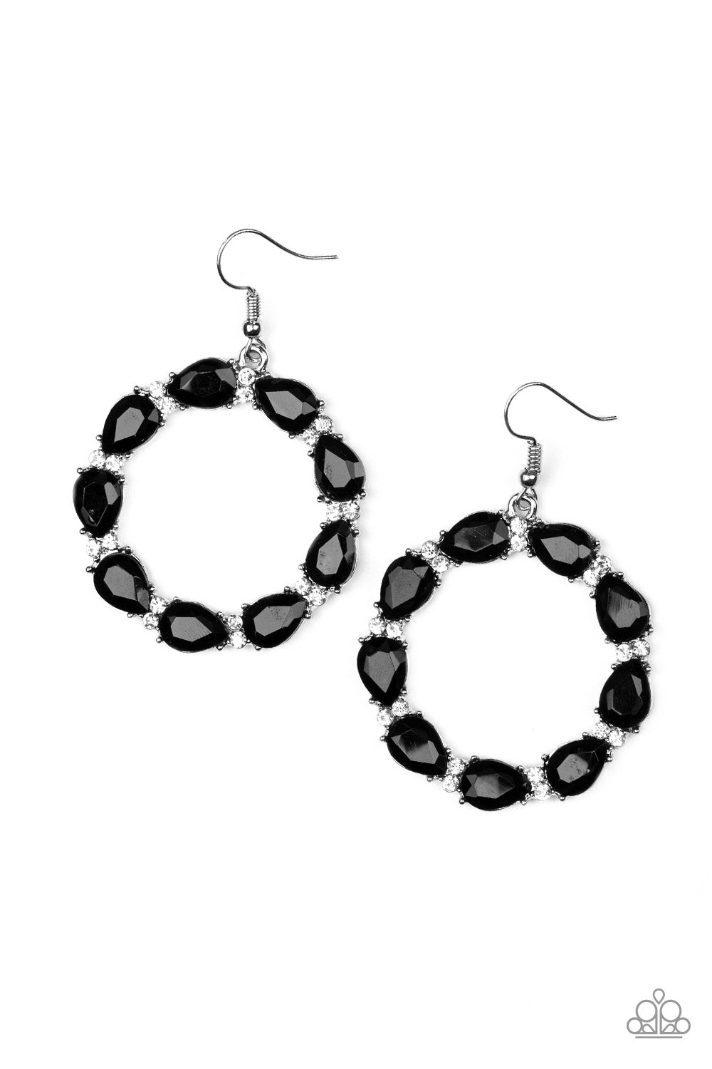 Glittery white rhinestones and teardrop gems circle into a sparkling hoop for a glamorous look. Earring attaches to a standard fishhook fitting.