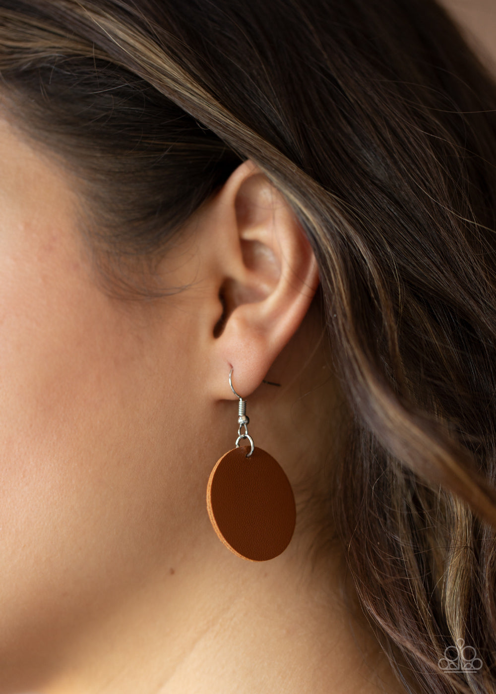 A shiny collection of mismatched silver rings and textured hoops link with round pieces of brown leather across the chest for a whimsically earthy look. The colorfully rustic compilation attaches to layered strands of shiny brown cording for a trendy finish. Features an adjustable clasp closure.