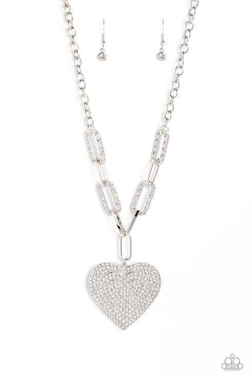 Elongated, oversized gold links, encrusted with a blinding display of white rhinestones and shimmery gold accents connect a classic gold chain to an exaggerated gold heart pendant for a romantically refined finish. Featured on the oversized gold heart, layers upon layers of glitzy white rhinestones emboss across its entire surface as the hearts gradually increase in size from the center. Features an adjustable clasp closure.