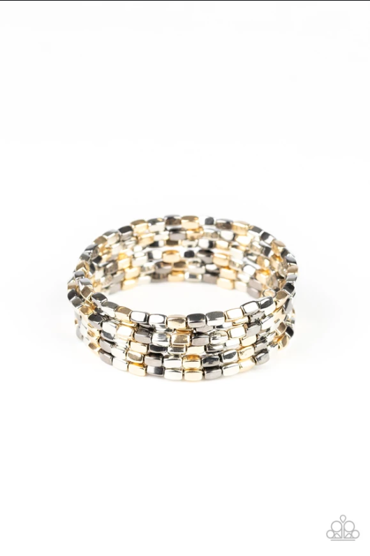 A glistening collection of rectangular rose gold beads are threaded along a coiled wire, creating a shimmery infinity wrap style bracelet around the wrist.