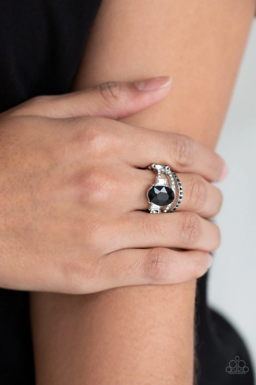 Encrusted with fiery red and glassy white rhinestones, three shimmery silver bands arc across the finger. The uppermost band is crowned with a dramatic red rhinestone for a regal finish. Features a stretchy band for a flexible fit.