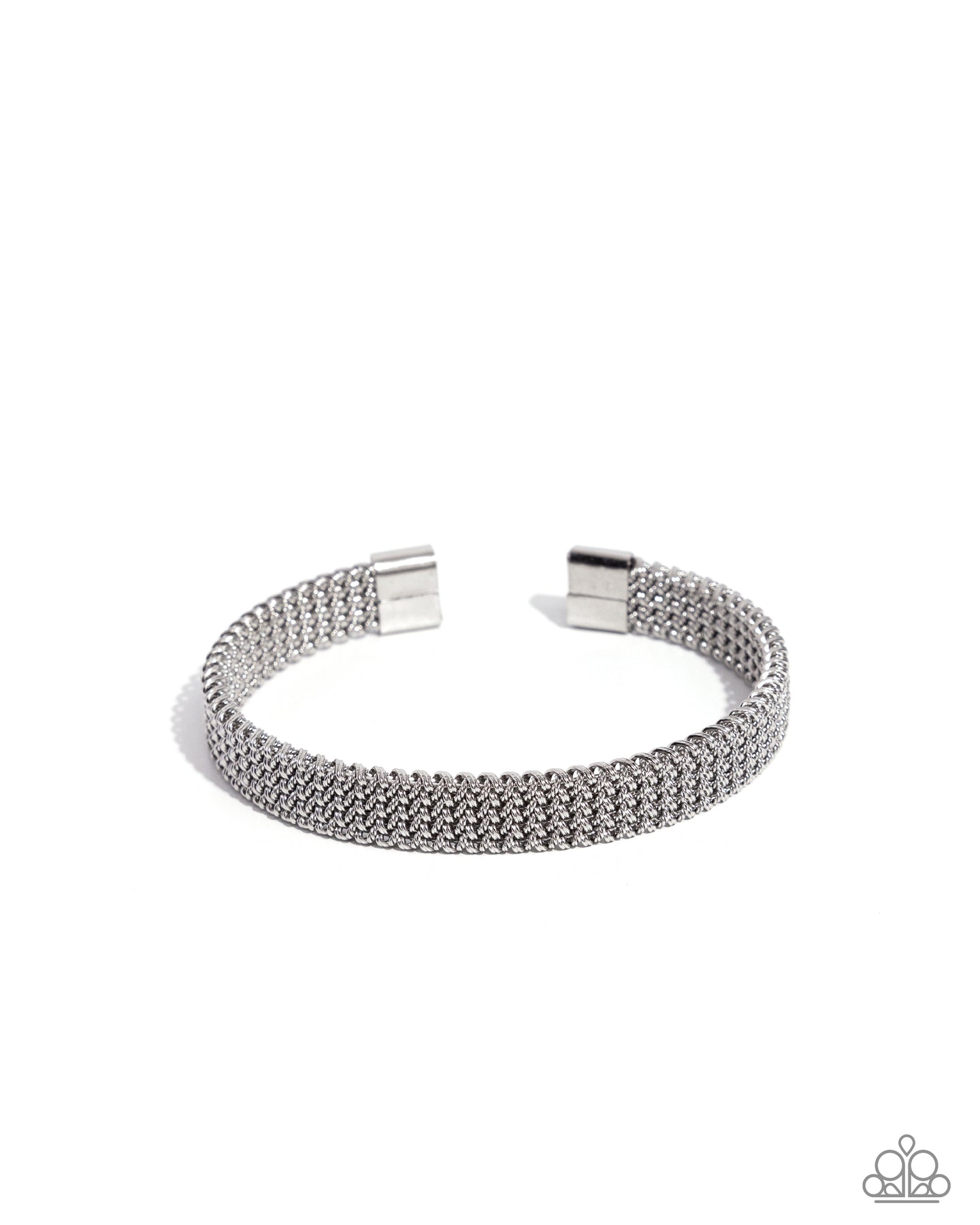 Featuring a chain mail-like motif, the front of a high-sheen silver cuff is embossed into row after row of swirling silver chains, creating a gritty look around the wrist.