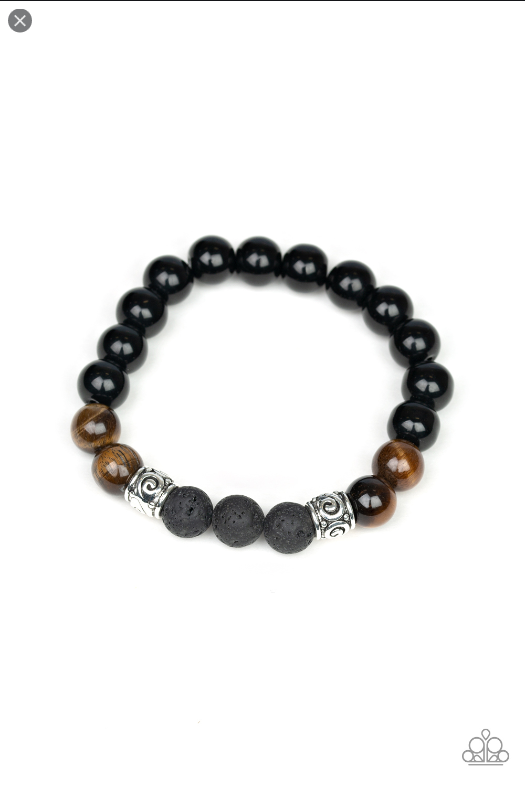 Infused with ornate silver beads, a collection of polished black beads, black lava rock beads, and speckled white stone beads are threaded along a stretchy band around the wrist for a seasonal look.