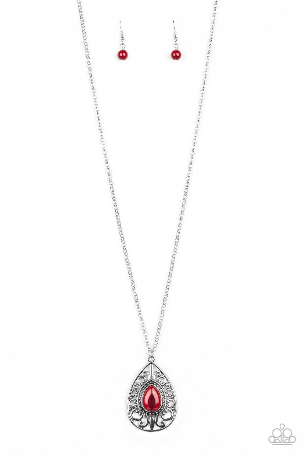 A glowing red moonstone is pressed into the center of a silver teardrop pendant swirling with regal filigree for a regal finish. Features an adjustable clasp closure.