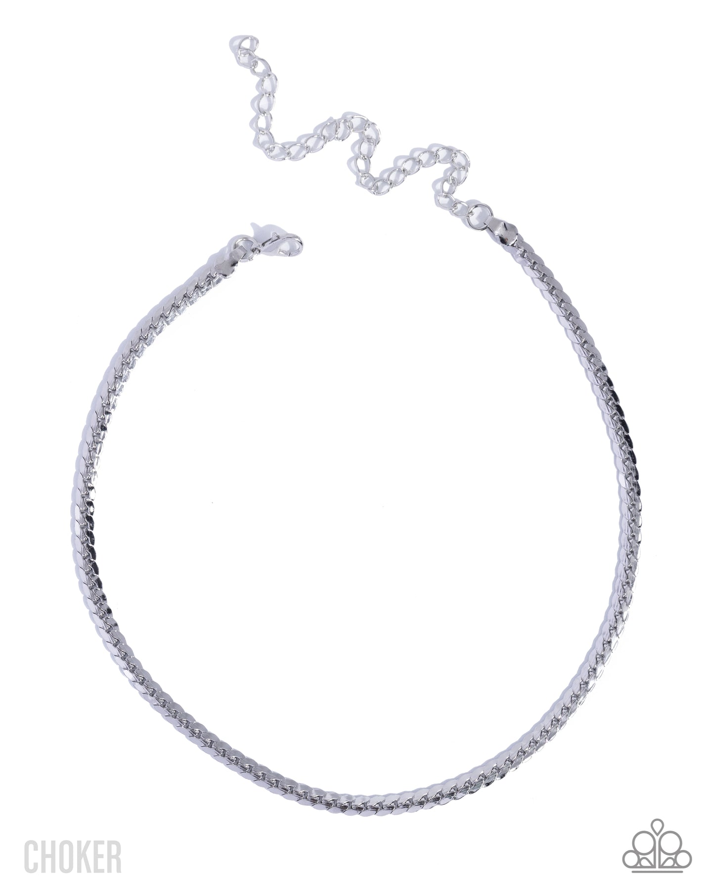 A strand of glistening, silver curb chain links creates a bold, yet minimalistic statement piece as it wraps around the neck in an industrial-inspired finish. Features an adjustable clasp closure.