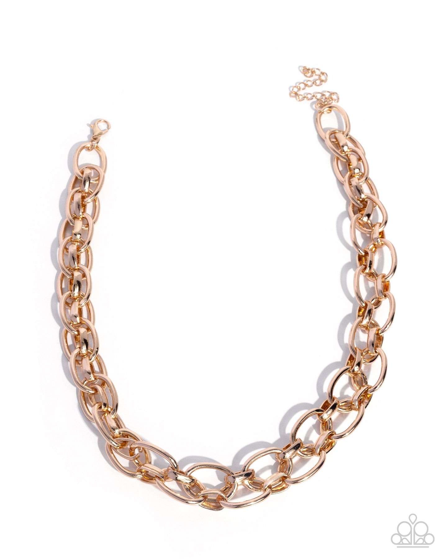 Featuring a high sheen, copious gold links in varying sizes coalesce and layer below the neckline for a modern, monochromatic display. Features an adjustable clasp closure.