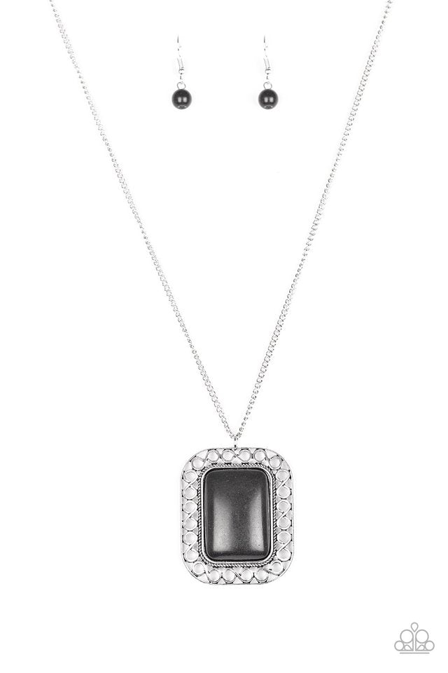 Chiseled into a tranquil rectangle, a smooth black stone is pressed into a shimmery silver frame swirling with texture for an artisan-inspired look. The earthy pendant swings from the bottom of a lengthened silver chain for a seasonal finish. Features an adjustable clasp closure.