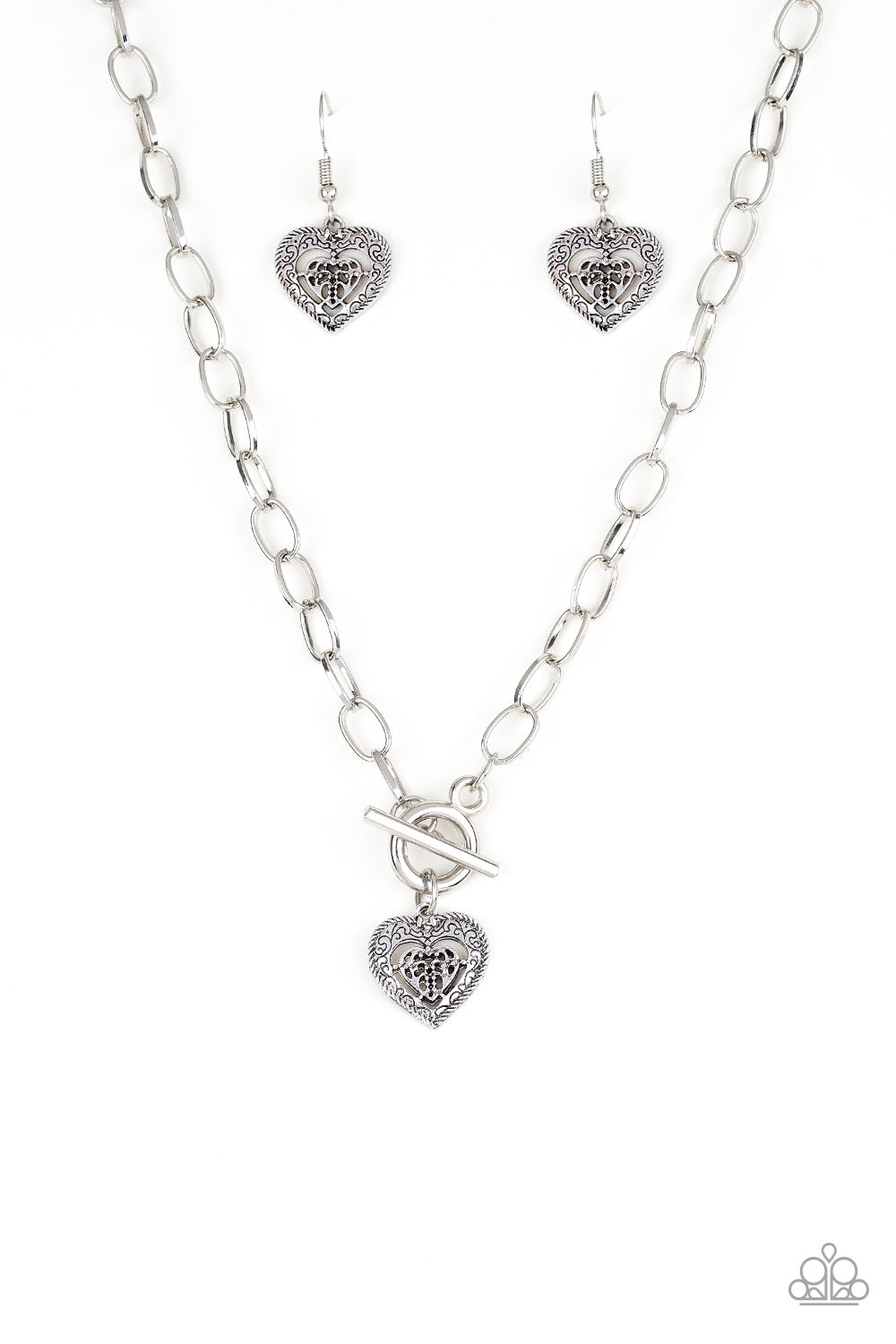 An ornate silver heart pendant swings below the collar for a vintage inspired look. Features a toggle closure.