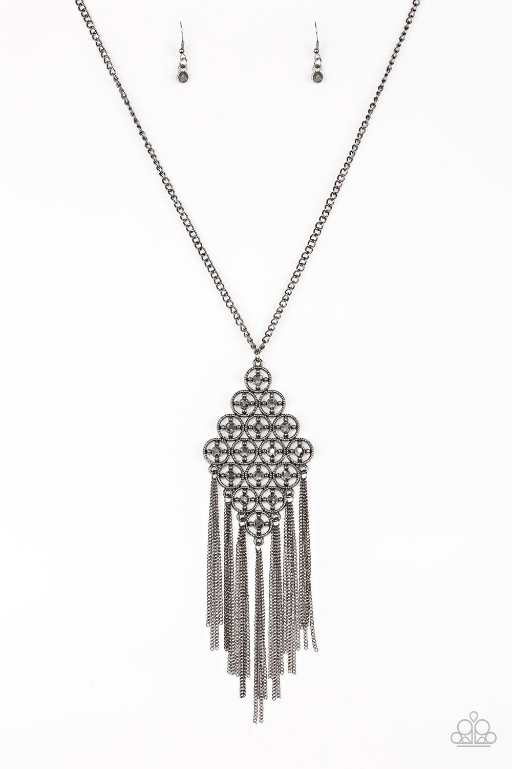 Dotted with glittery hematite rhinestone centers, glistening gunmetal rings connect into a bold diamond-shaped pendant. Sections of shiny gunmetal chain tassels stream from the bottom of the regal frame, adding shimmery movement to the dramatic centerpiece. Features an adjustable clasp closure.