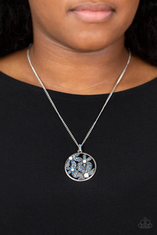 Dotted with opal white rhinestone centers, a clustered bouquet of iridescent blue rhinestone petaled flowers bloom inside a textured silver hoop, coalescing into an enchanting floral pendant at the bottom of an extended silver frame. Features an adjustable clasp closure.