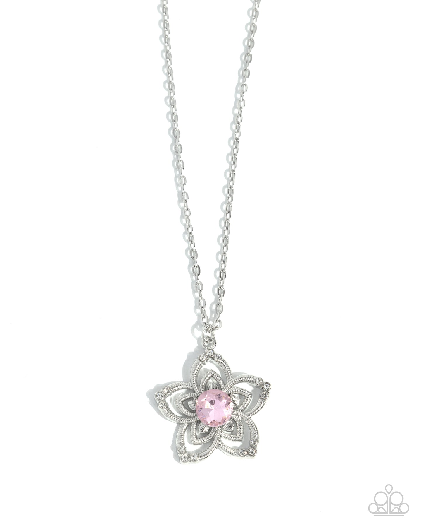 Featuring coiled textures, a three-dimensional silver flower with white rhinestone-dotted petals and an oversized baby pink cubic zirconia center glides below the neckline along a silver cable chain for an eye-catching ethereal display. Features an adjustable clasp closure.