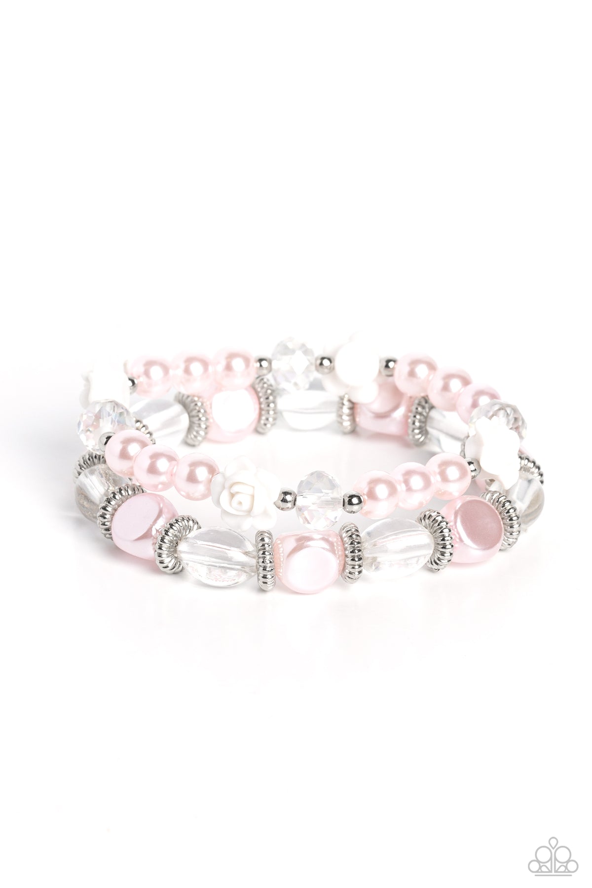 Baby pink pearls, silver studded rings, varying shapes of baby pink and clear beads, silver accents, faceted clear beads, and white resin roses stretch across elastic stretchy bands around the wrist for a refined, floral display.