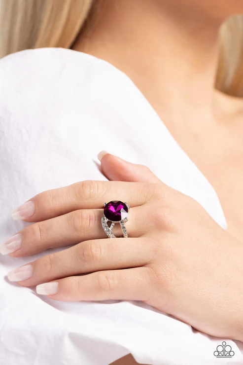 Glistening silver bars and white rhinestone-encrusted bands swirl across the finger, coalescing into an airy band. Featuring a regal faceted surface, a glittery red gem is pressed into the center of the frame in silver-pronged fittings for a refined finish. Features a stretchy band for a flexible fit.
