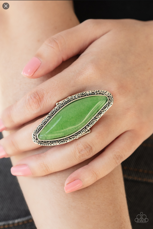 An oblong sparkling purple stone is pressed into a shimmery silver frame embossed and studded in tactile filigree, creating a dramatic stone display atop the finger. Features a stretchy band for a flexible fit.