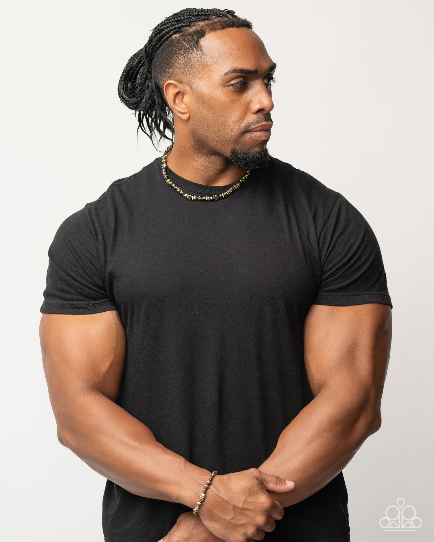 Infused along an elastic stretchy band, a collection of oil spill-brushed pebbles alternates with oil spill chiseled beads along the wrist for a uniquely urban statement.