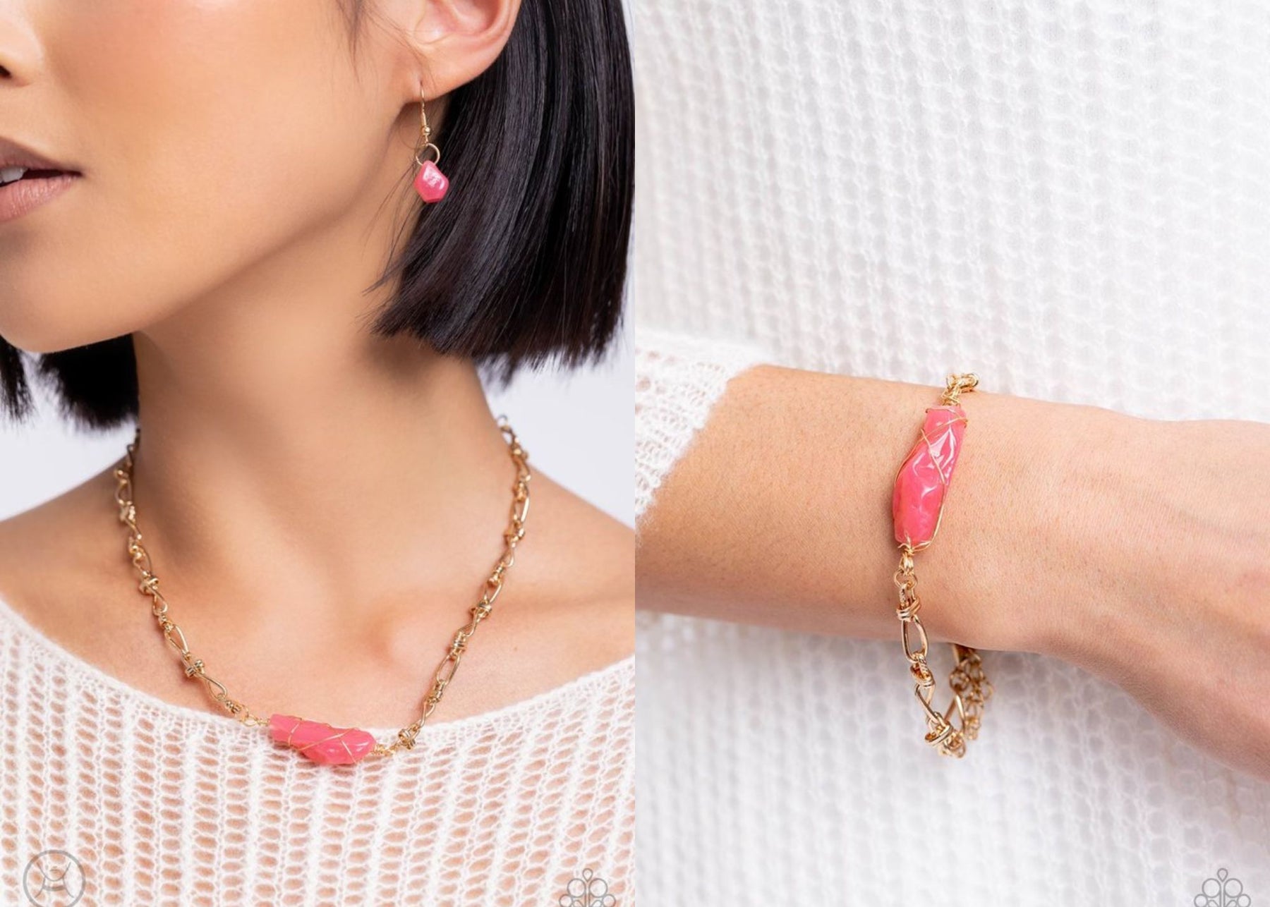 Delicately wrapped in gold wire and infused along a high-sheen gold chain, a chiseled piece of pink stone rests along the curvature of the collar, creating a decadently earthy display. Features an adjustable clasp closure. As the stone elements in this piece are natural, some color variation is normal.