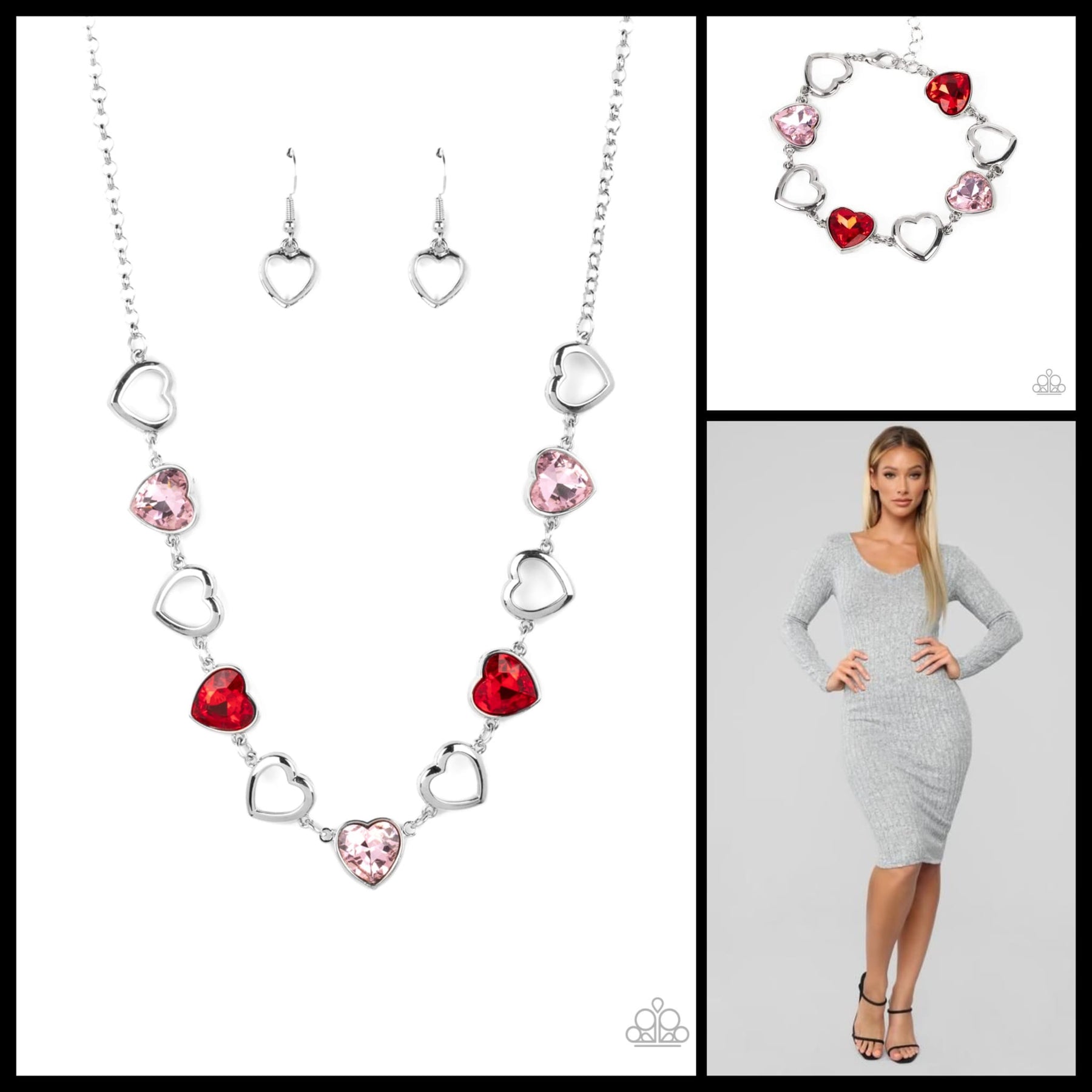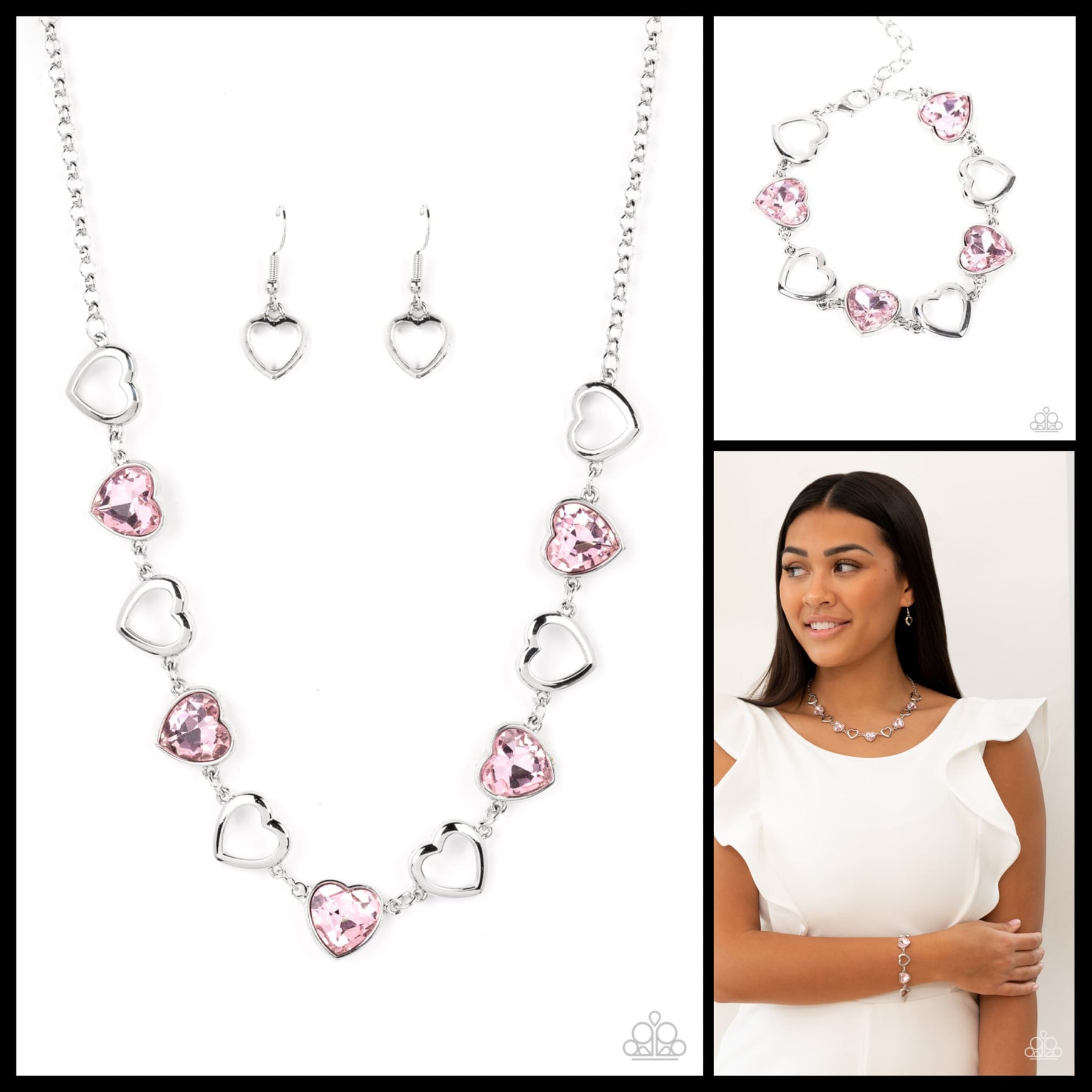 Shiny, silver silhouette hearts alternate between faceted pink heart gems pressed into silver frames. The high-sheen and sparkly display coalesce around the collar for a cupid-like charm. Features an adjustable clasp closure.