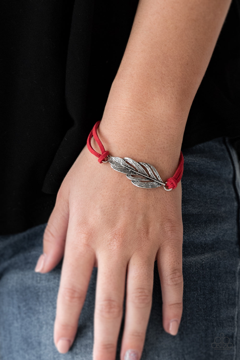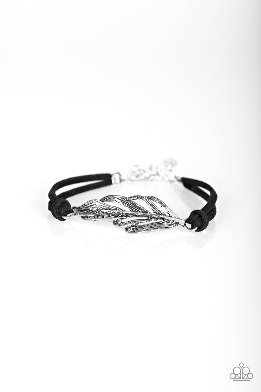 Strands of refreshing blue suede knot around a shimmery silver feather charm, creating a seasonal pendant atop the wrist. Features an adjustable clasp closure. Paparazzi Accessories