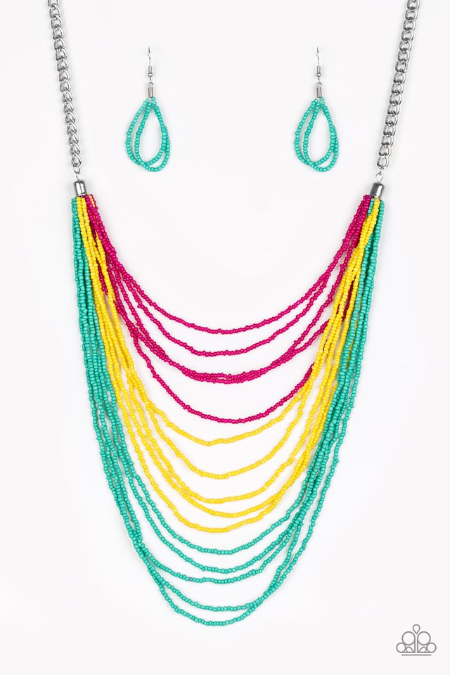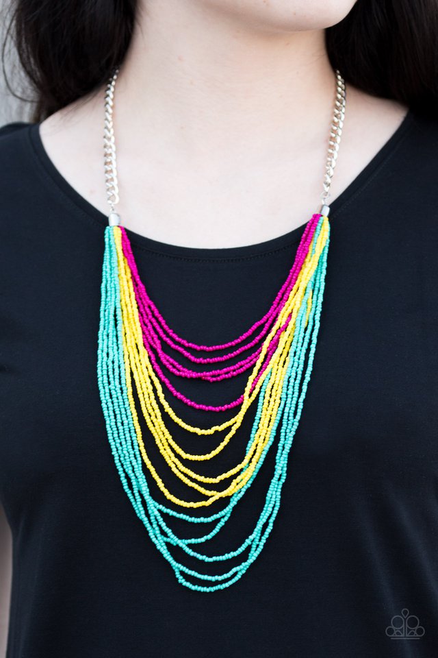 Vivacious strands of pink, yellow, and turquoise seed beads cascade down the chest, creating summery layers. Features an adjustable clasp closure.