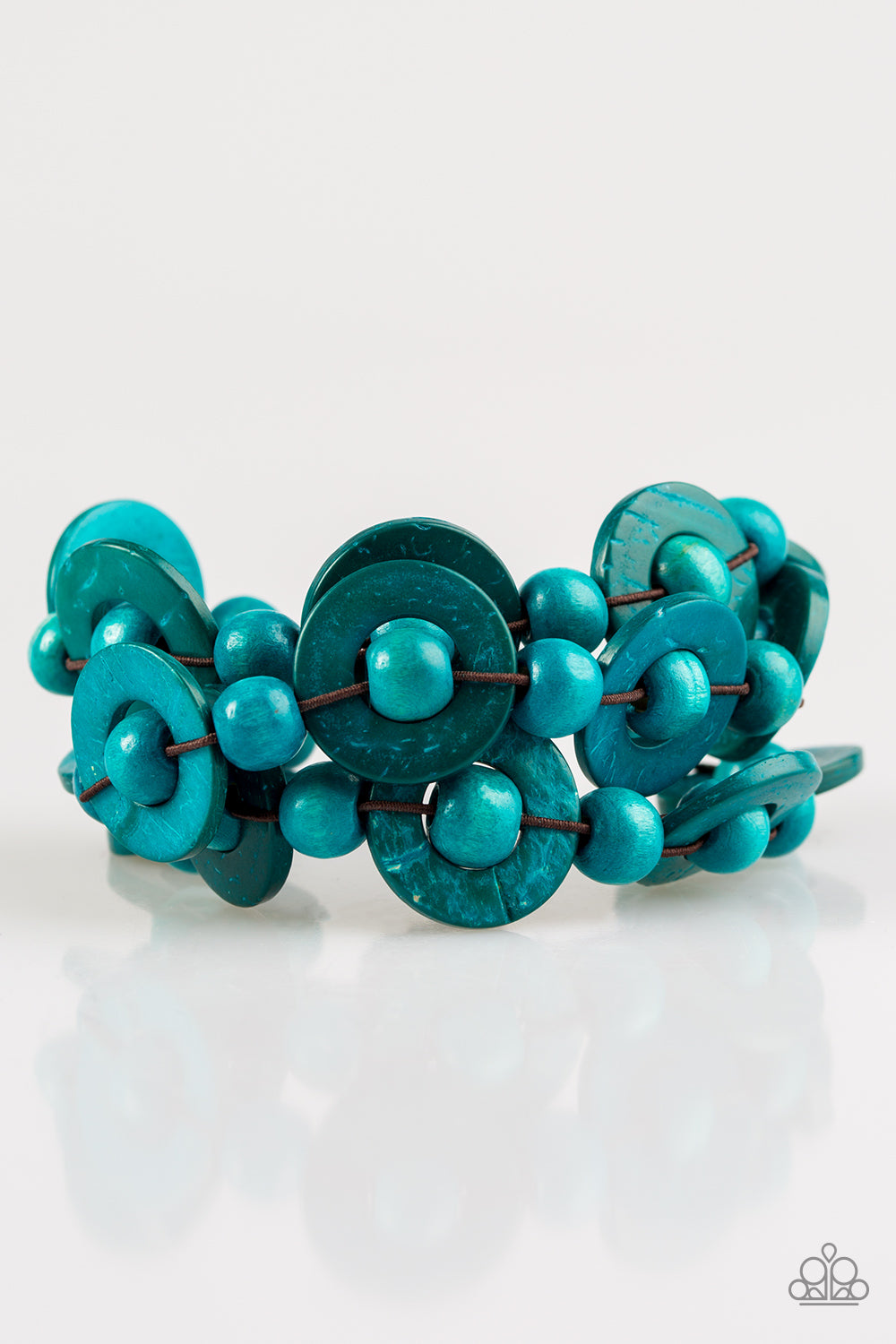 Brushed in refreshing blue finishes, wooden rings and beads are knotted in place along three stretchy strands, creating summery layers around the wrist. Features a button loop closure.