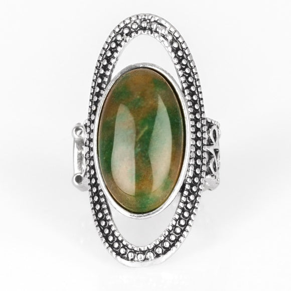 A studded silver frame encircles a shiny black stone center, creating a dramatic Southwestern inspired look atop the finger. As the stone elements in this piece are natural, some color variation is normal. Features a stretchy band for a flexible fit.