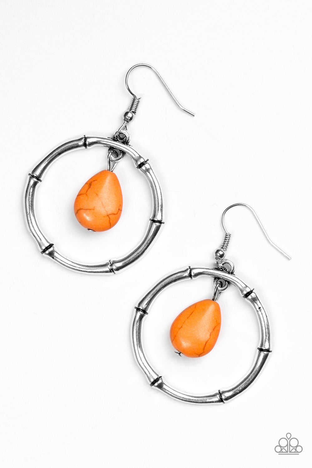 Chiseled into a tranquil teardrop, an earthy orange stone swings from the top of a textured silver hoop, creating a handcrafted, artisan inspired lure. Earring attaches to a standard fishhook fitting.