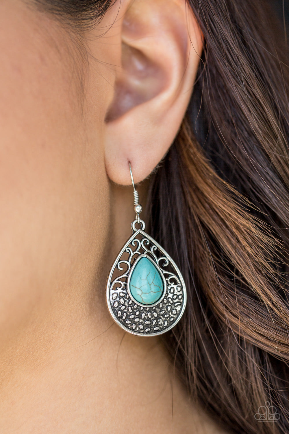 A sunny yellow stone is pressed into the center of a shimmery silver teardrop radiating with dotted and frilly filigree textures for a seasonal look. Earring attaches to a standard fishhook fitting.