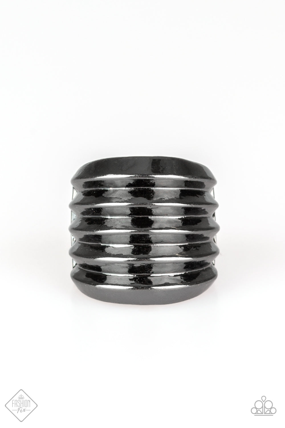 Rippling gunmetal bands stack into a thick frame around the finger for a dramatic industrial look. Features a stretchy band for a flexible fit.