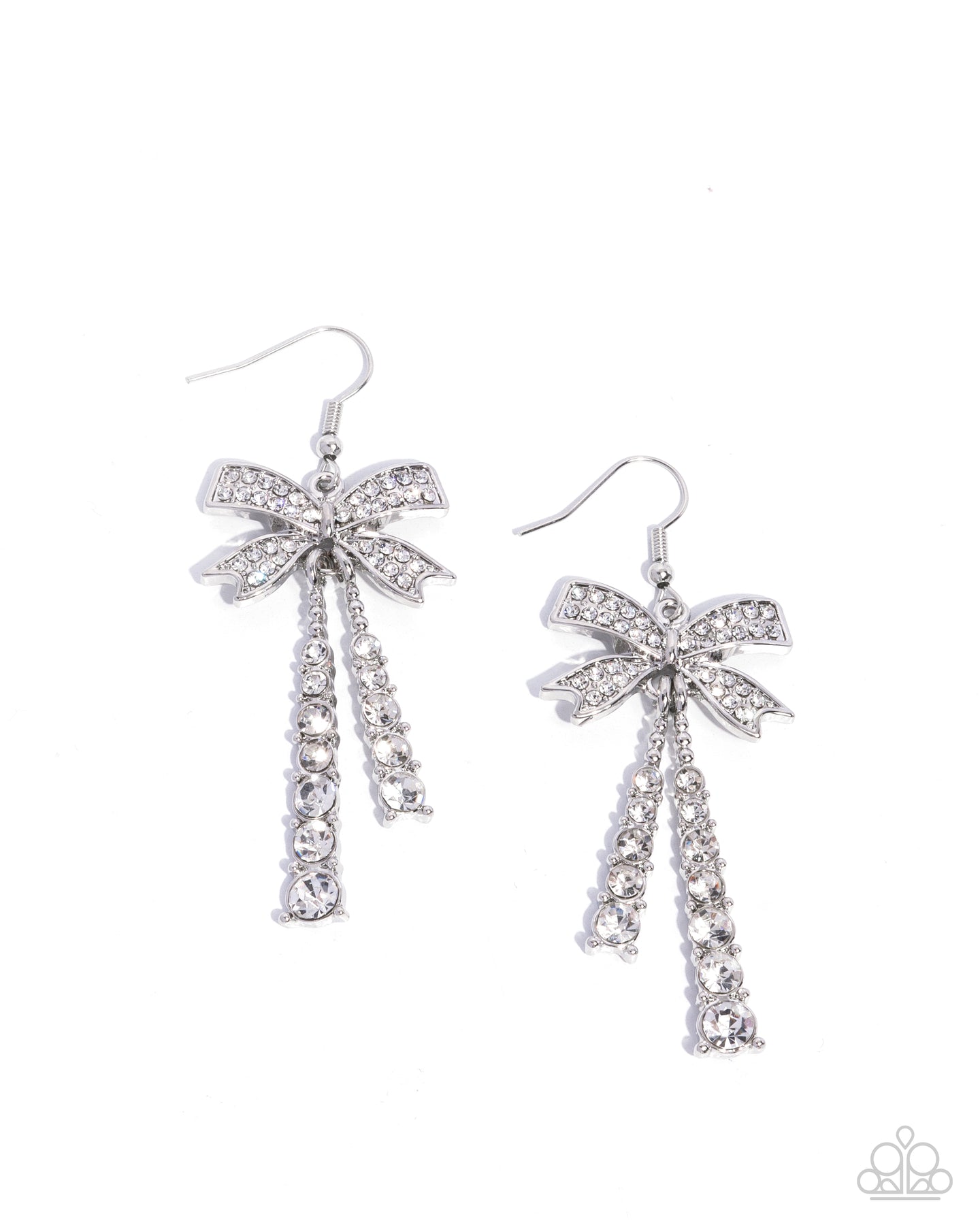 Adorned in sparkling white rhinestones, high-sheen bands of silver curl and loop into a stunning bow charm, creating a classy statement at the ear. Silver beads and white gems encased in scalloped silver fittings gradually increase in size as they dangle from the bow charm, adding a refined tapered tassel to the stunning display. Earring attaches to a standard fishhook fitting.