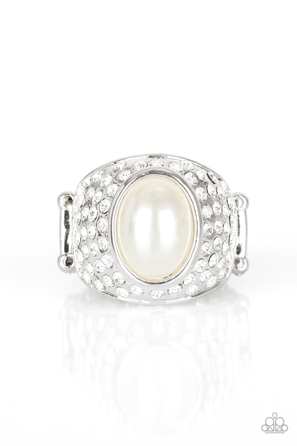 A pearly white bead is pressed into the center of a bold silver band radiating with countless white rhinestones, creating a dramatic statement piece atop the finger. Features a stretchy band for a flexible fit.