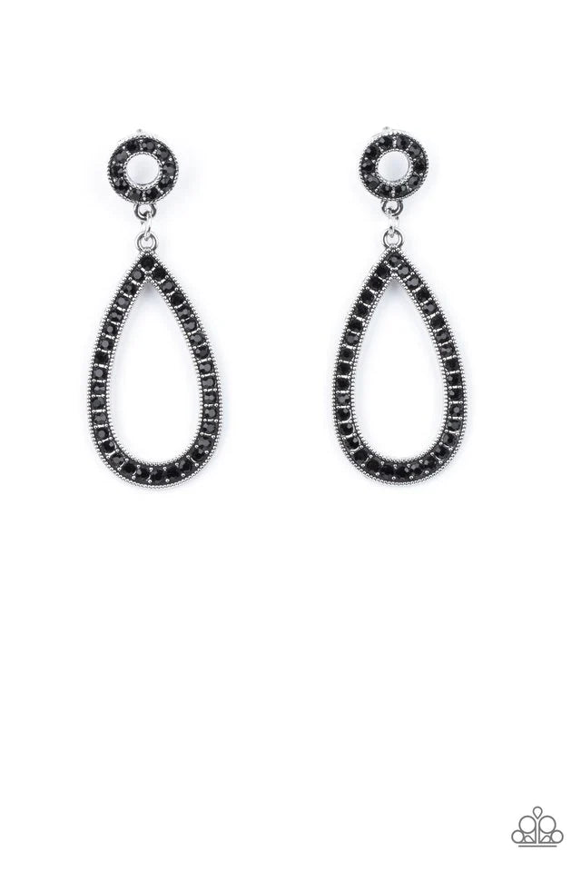 Alluring oversized teardrop frames are encrusted with countless brilliant white rhinestones. A smaller circle frame filled with the same shimmering white rhinestones gently anchors and balances the flirtatious look. Earring attaches to a standard post fitting.