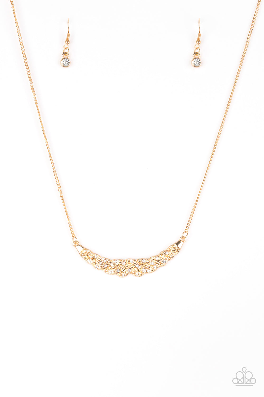 Encrusted in glassy white rhinestones, studded gold bars braid into a bowing pendant below the collar for a refined fashion. Features an adjustable clasp closure.