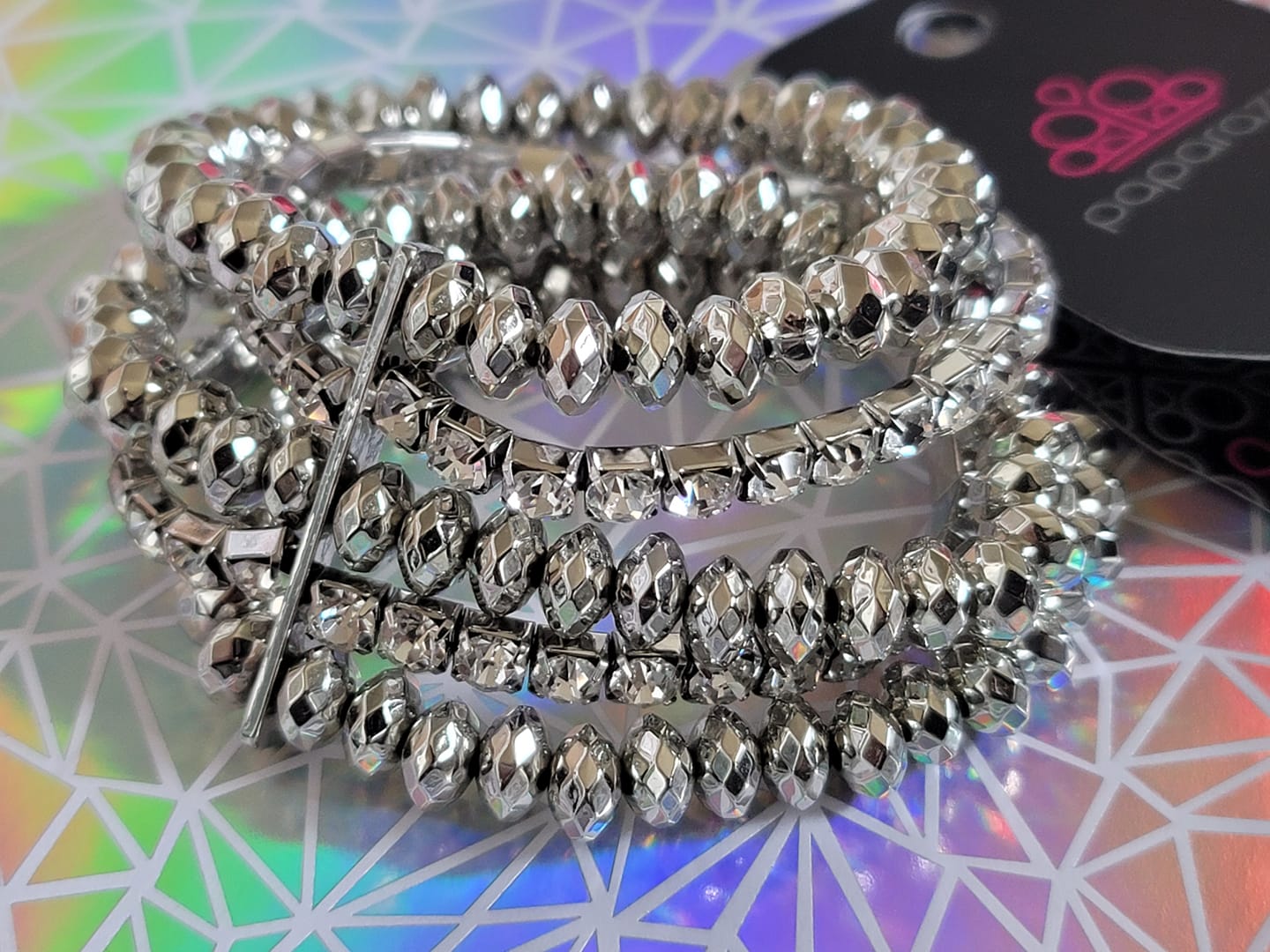 Held together with a sleek gunmetal fittings, edgy rows of faceted gunmetal beads and glittery white rhinestones are threaded along stretchy bands around the wrist, creating glamorous layers.