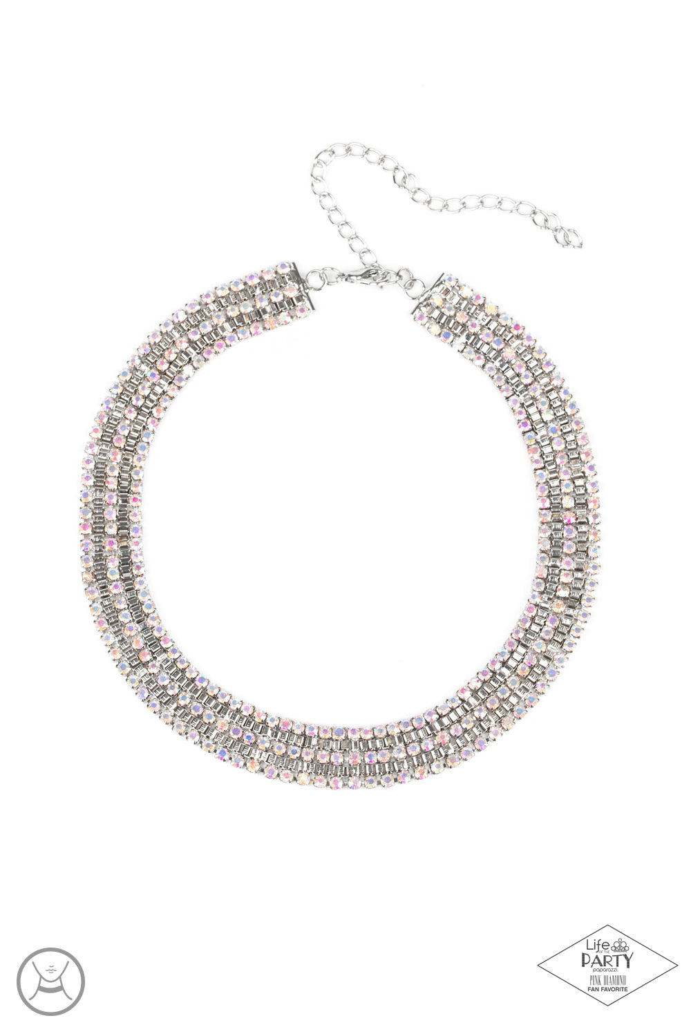 Featuring sleek square fittings, strands of glittery iridescent rhinestones connect with rows of silver box chain around the neck for a glittery twist. Features an adjustable clasp closure.