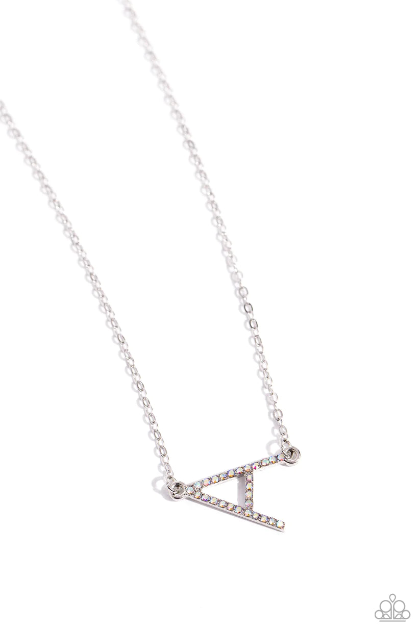 Embossed with dainty iridescent rhinestones, a silver letter "A" hovers below the collar from a dainty silver chain, for a sentimentally simple design. Features an adjustable clasp closure. Due to its prismatic palette, color may vary.