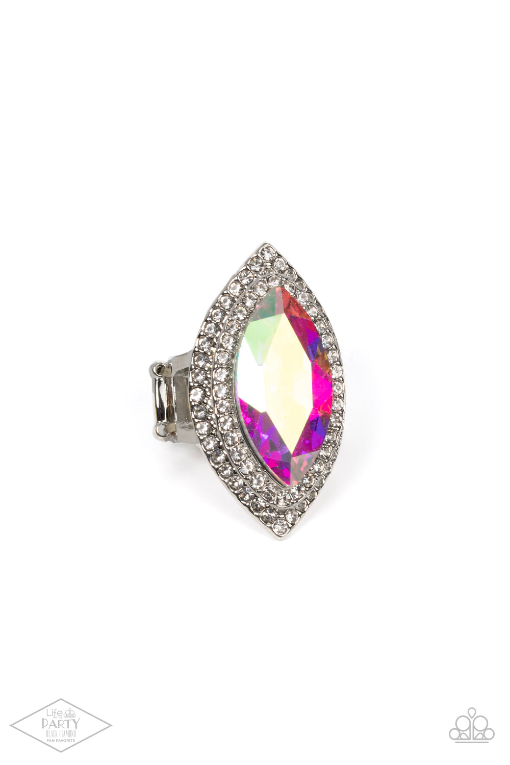 A dramatic white gem is pressed into the center of stacking silver frames encrusted in row after row of glassy white rhinestones for a blinding look. Features a stretchy band for a flexible fit.