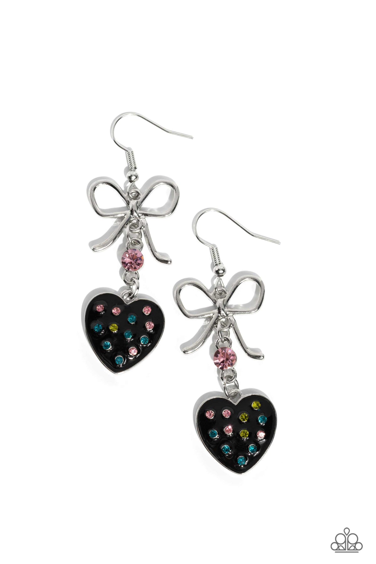 Featuring airy loops, a dainty silver bow gives way to a black-painted heart frame adorned in dainty yellow, blue, and pink rhinestones for a flirtatious fashion. A bigger pink rhinestone separates the silver bow and black heart for an additional pop of feminine color. Earring attaches to a standard fishhook fitting.