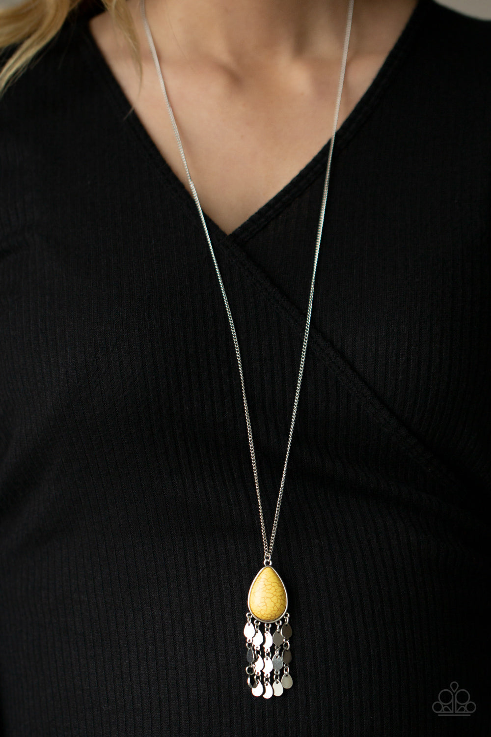 A vivacious pink stone teardrop pendant swings from the bottom of a lengthened silver chain. Tassels of silver teardrop frames trickle from the bottom of the colorful pendant, creating a musical fringe. Features an adjustable clasp closure.