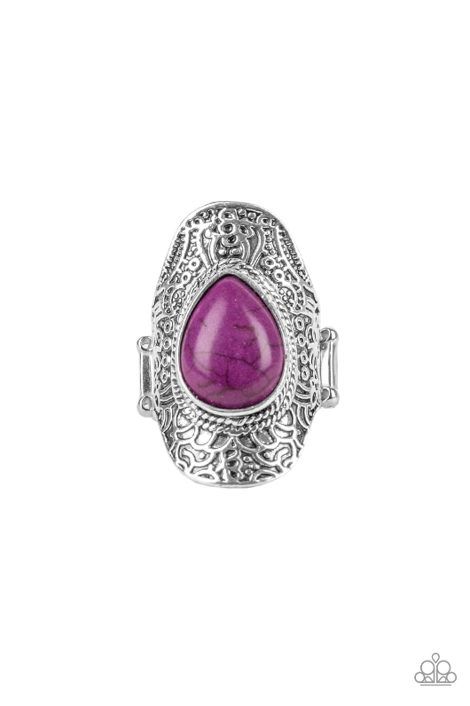 Embossed in ornate silver filigree, an oval silver frame folds around the finger. Chiseled into a tranquil teardrop, a sunny yellow stone is pressed into the center of the decorative frame for a seasonal finish. Features a stretchy band for a flexible fit.