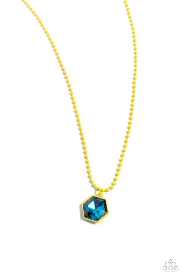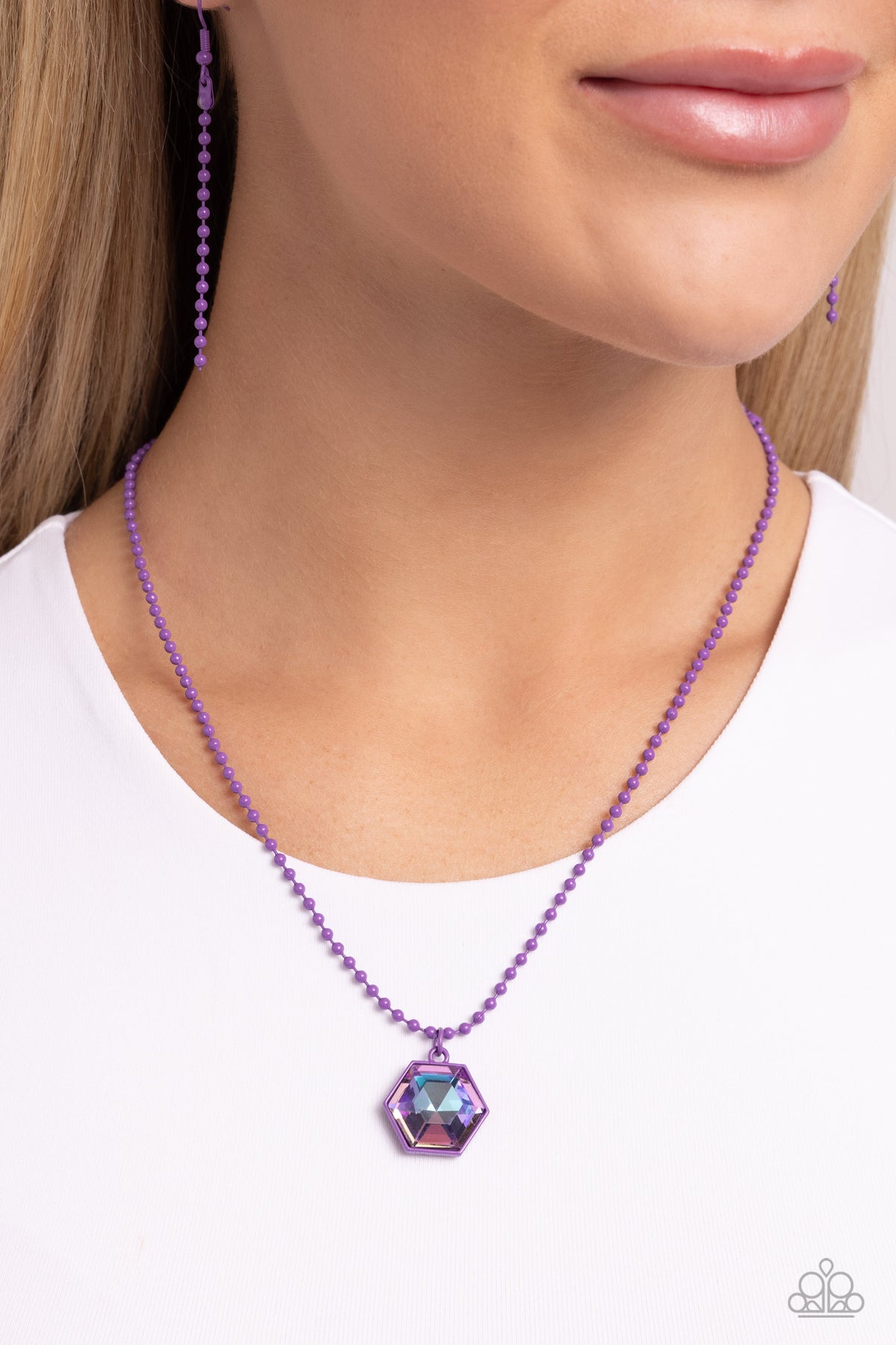 Featuring a faceted shimmer, a hexagonal-cut multicolored gem is pressed into a vibrant purple frame that runs along a vibrant purple ball chain for a colorful finish. Features an adjustable clasp closure.