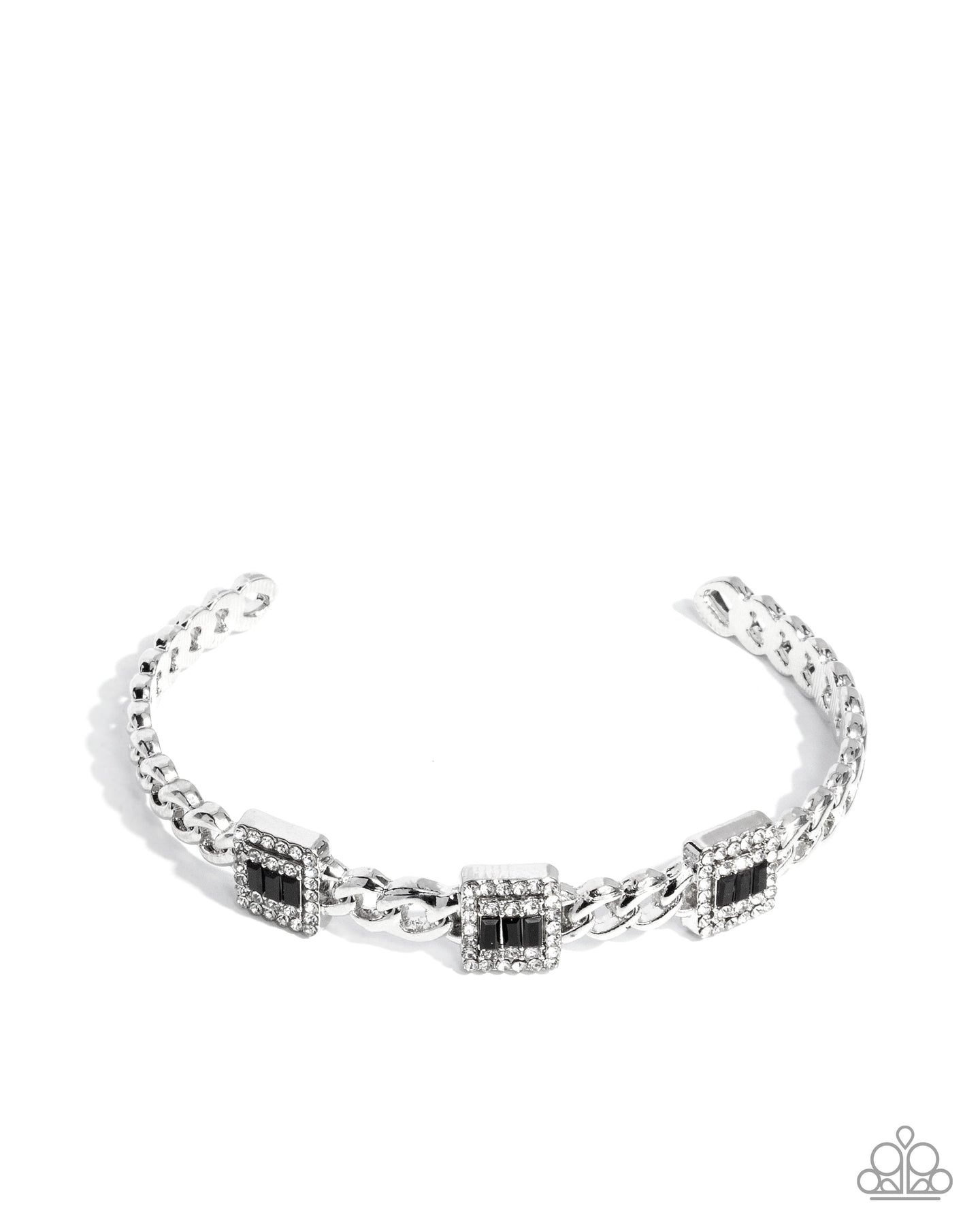 Pressed in a doubled square frame of white rhinestones, a trio of emerald-cut black gems glisten atop a silver curb chain-inspired cuff for a twinkling trio display.